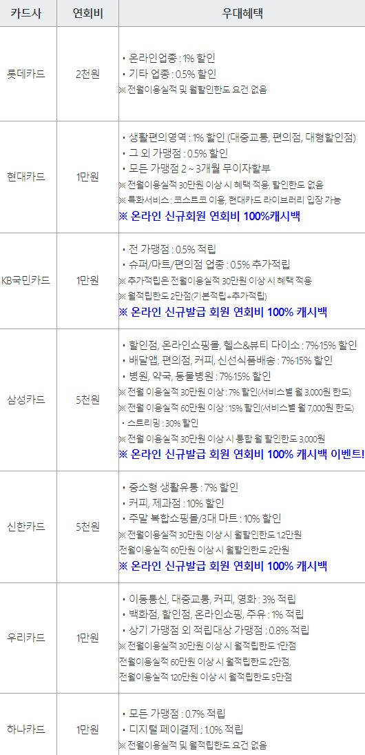 7개 카드사의 연회비 및 혜택은 아래와 같습니다.