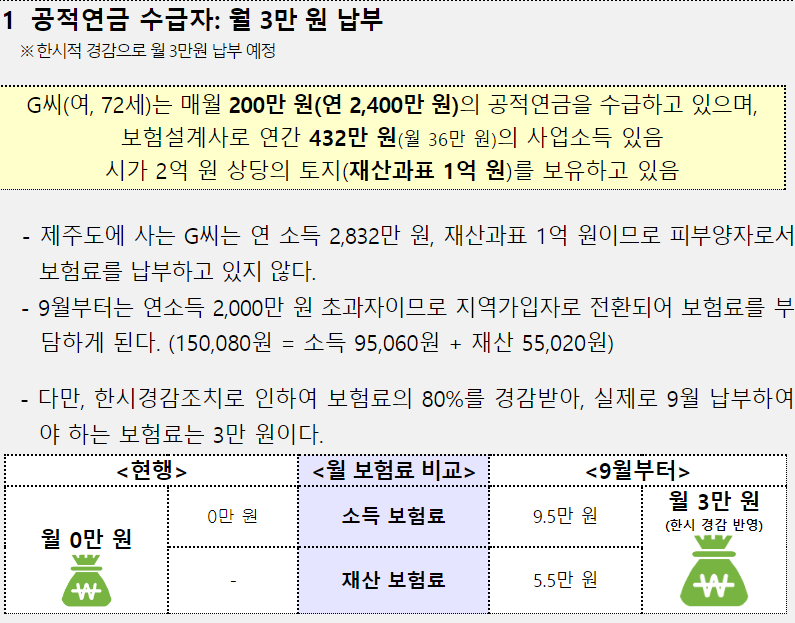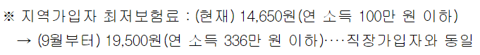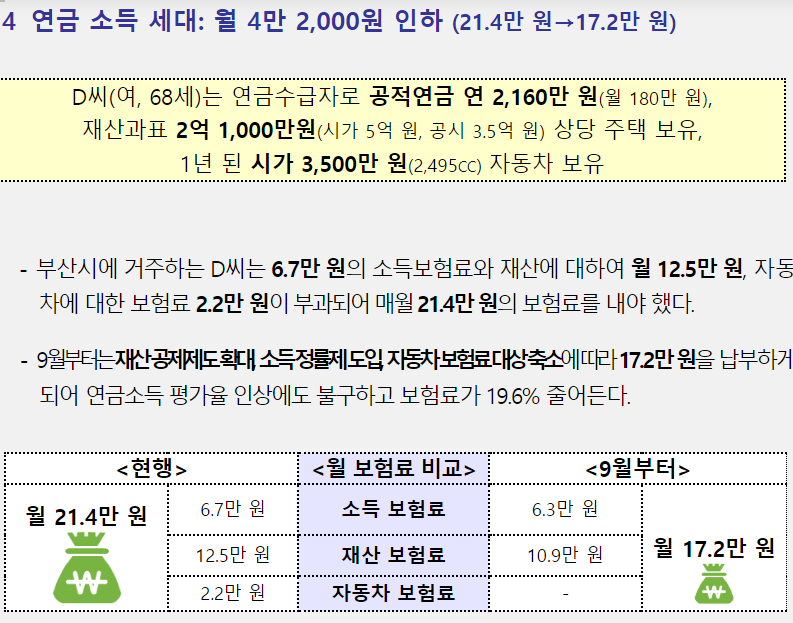 이런 문제점들을 개선하기 위해 피부양자의 소득재산 인정기준을 강화하고 재산 보험료 비중을 줄여가는 소득 중심 건강보험 부과체계 개편안을 개정하여 9월 1일부터 시행할 예정입니다.
