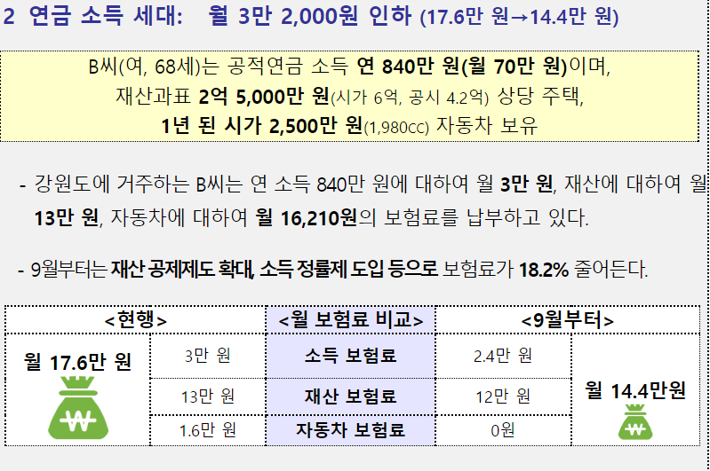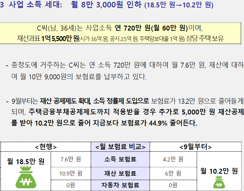 지역가입자의 재산 및 자동차 보험료 축소와 소득정률제 도입으로 지역가입자 중 65%의 보험료가 24%(월 평균 3만 6천원)낮아져서 지역가입자는 전체적으로 연간 2조 4천억원 가량의 보험료 부담이 줄어듭니다.