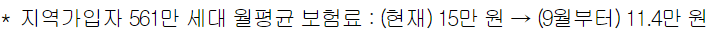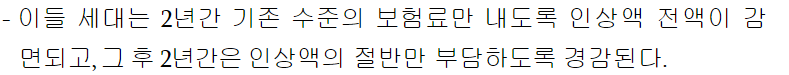보건복지부는 국회에서 여,야 합의에 따른 2차 개편안을 9월 1일에 시행하기로 했고 보험료가 인상되는 일부 세대에 한하여 최근 물가 상황 등 경제적 여건을 고려하여 , 한시적 경감을 적용하기로 했습니다.