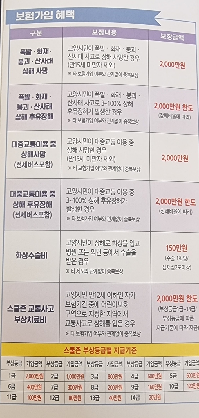 고양시는 고양시민에게 불시에 일어날 수 있는 사고에 대비해 치료비 지원 등 경제적 도움을 줄 수 있는 제도적 보험 장치를 갖고 있습니다. 만일 고양시민일 경우 모두 다 자동으로 가입됩니다.(고양시 시민안전보험)