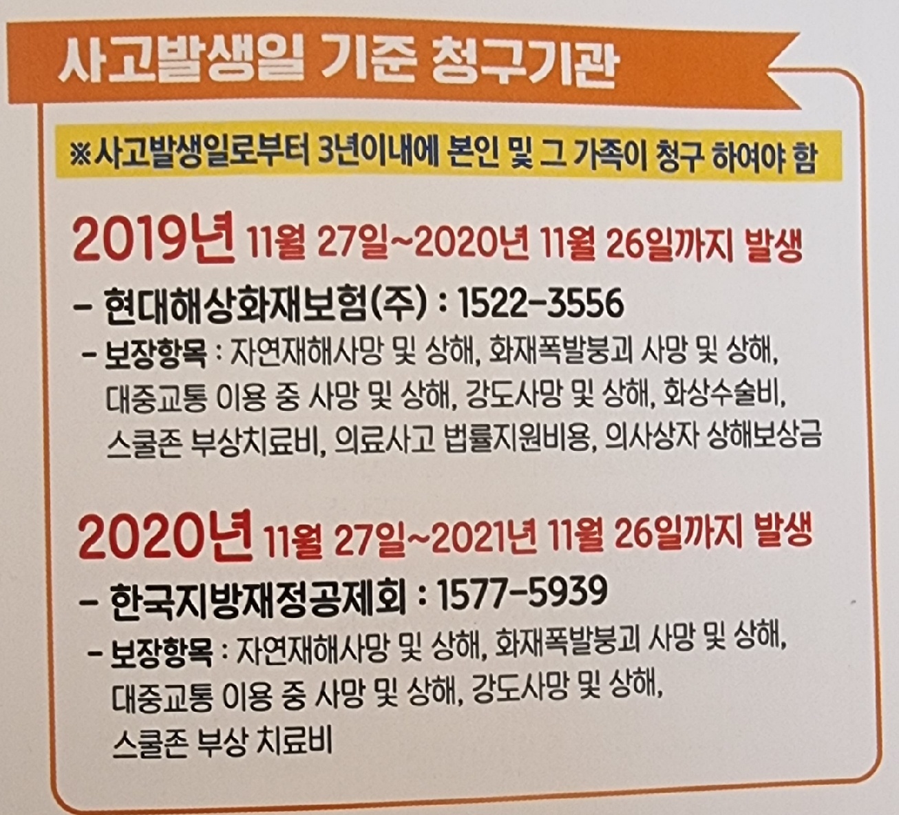 4. 이런 정책을 몰라서 신청을 하지 못 했어요 전에 일어난 사고도 청구가 가능한가요? :-블로그 잘 찾아오셨습니다. 가능합니다 ㅎㅎ 사고 발생일로부터 3년 이내 사고에 관하여 보험금 청구가 가능하고 본인이나 그 가족이 청구하면 됩니다.