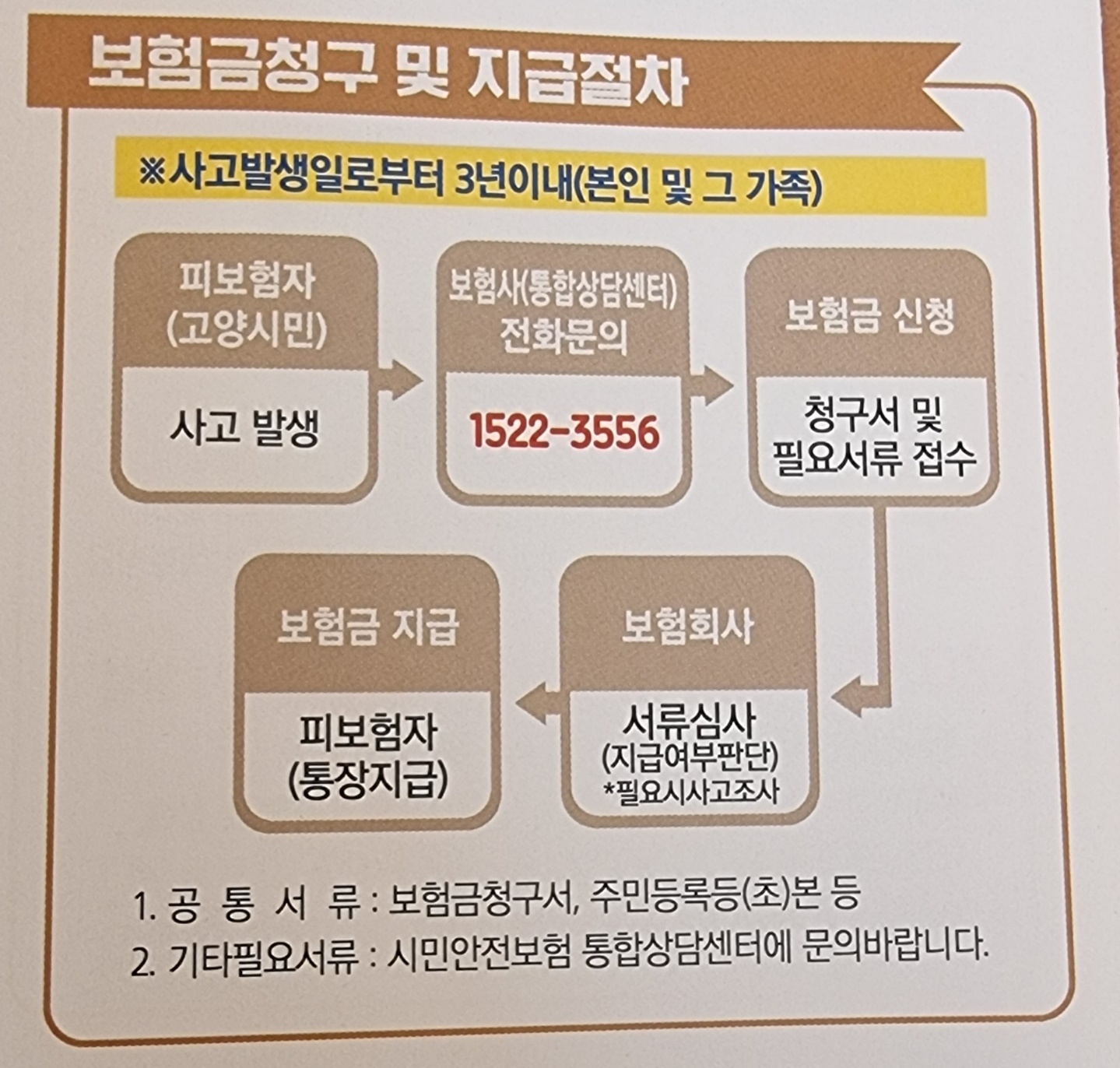 사고 발생일로부터 3년 이내이며, 사고 발생 시 통합상담센터에 전화 문의를 하고 보험금을 신청합니다. 청구서 및 필요서류를 접수하면 보험회사에서 서류를 심사하고 지급 여부 판단에 이상이 없다면 보험금은 피보험자인 고양시민 당사자 통장으로 입금됩니다.