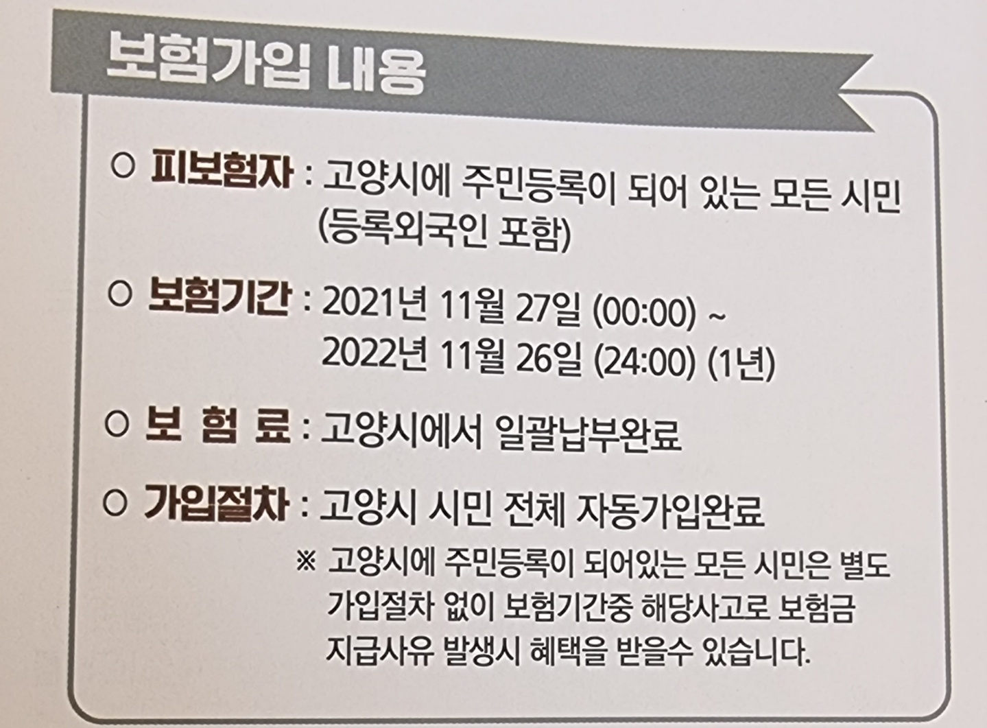 피보험자는 고양시에 주민등록이 되어 있는 모든 시민이며, 보험기간은 2021년 11월 27일부터 2022년 11월 26일까지 1년입니다. 보험료는 고양시에서 일괄 납부하며, 가입절차는 위에 적었듯이 따로 없고 고양시민이라면 자동으로 가입됩니다.