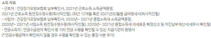 - 소득을 산정할 때는 최근 1개년 증빙소득으로 산정하며 소득 발생 기간이 1년 미만인 경우 연환산 소득으로 계산합니다.