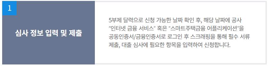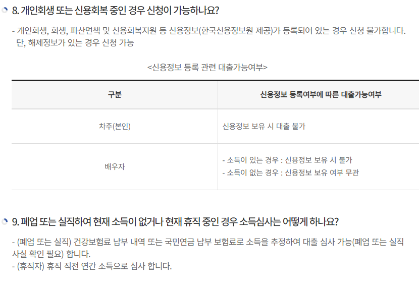 - 신용정보 = 한국신용정보원 "신용정보관리규약"에서 정하는 연체,부도,회생 등 신용정보가 남아있는 경우 신청불가능하며, 부부가 공사 내규에 의한 채무관계자로 규제되고 있는 경우에도 신청 불가능합니다.