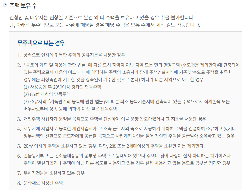 - 주택기준의 경우 1주택자여야 하며 시세가 6억원 이하 주택이어야 합니다.