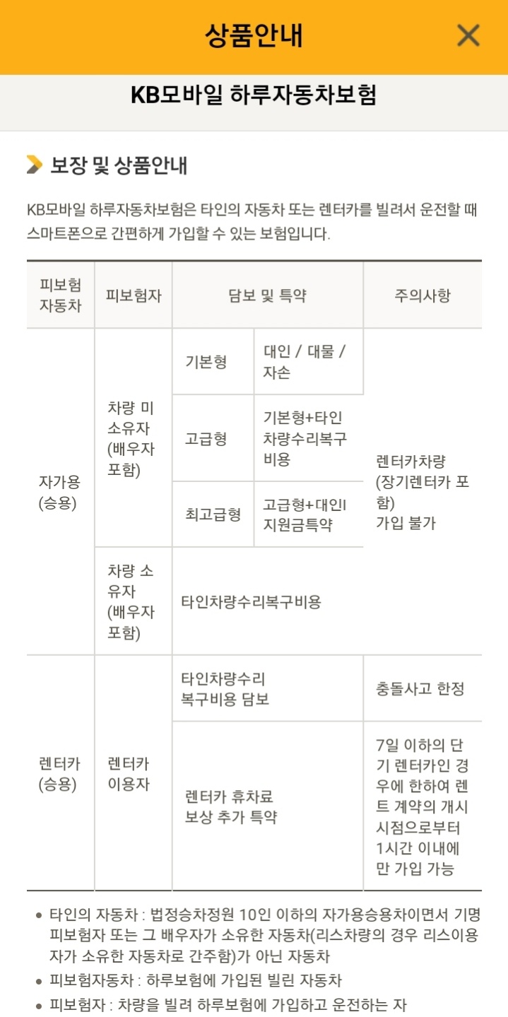 KB모바일 하루자동차보험의 자세한 보장내용 및 한도와 가입절차 및 보험료는 아래를 참고하시면 됩니다.