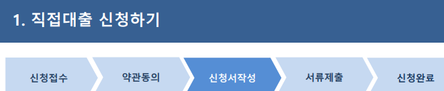 1. 신청 접수 2. 약관 동의 3. 신청서 작성 4. 서류제출 5. 신청 완료 순으로 끝이 납니다.