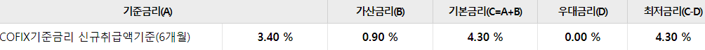 금리는 위와 같으며 기준금리 + 가산금리를 적용합니다.