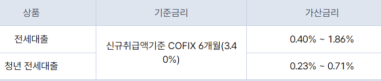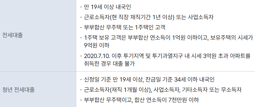 이 상품은 일반전세대출 및 청년전세대출로 나누어지며 대출 조건은 아래와 같습니다.