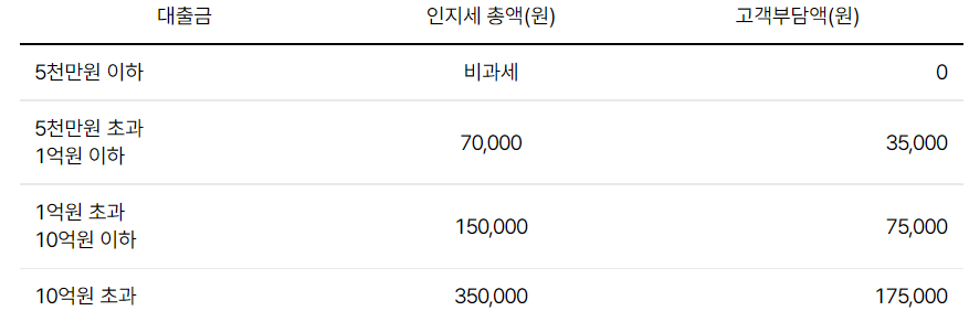 인지세란 대출거래 신규 약정 시 내는 세금으로 대출금액에 따라 아래와 같이 인지세액이 차등 적용되며 이 인지세는 은행과 고객이 각각 50%씩 부담합니다.