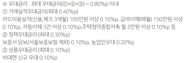 대출금리 계산은 각 보증별 기준금리가 다르니 우대금리조건만 알려드리겠습니다.