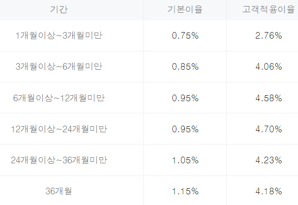 가입기간은 1개월 이상 336개월 이내로 만기일은 월 단위로 지정이 가능하며 가입기간에 따른 금리는 아래와 같습니다.