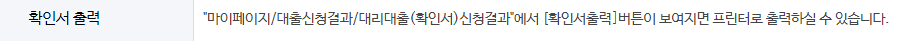 확인서 출력 "마이페이지/대출신청결과/대리대출(확인서)신청결과"에서 [확인서출력]버튼이 보여지면 프린터로 출력하실 수 있습니다.