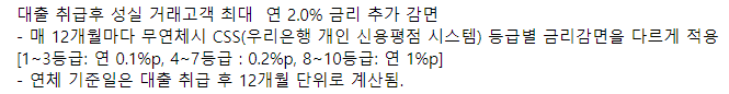 대출 거래 시 성실상환자(12개월 기준 무연체자)는 금리감면 혜택을 받을 수 있으며 신용등급에 따라 금리가 나뉩니다.