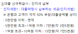 대출거래 약정을 새로 할 때 인지세라는 것이 존재하는데 인지세란 인제세법에 의해 대출약정시 납부하는 세금으로 5천만원 이하의 대출금액이라면 인지세는 비과세로 면제입니다.