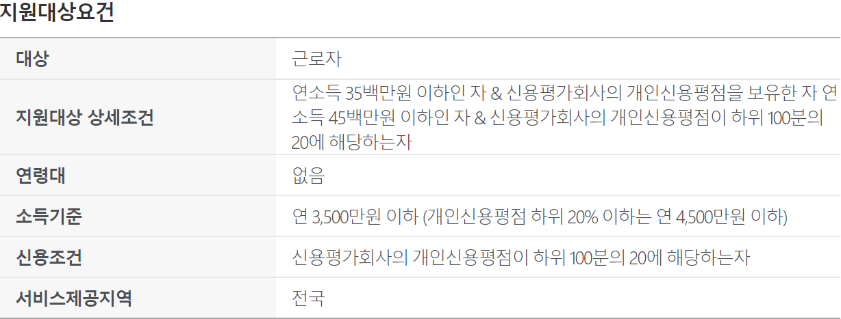 - 연소득 4천 5백만원 이하이면서 개인신용평점이 하위 20%이하인 분(신용등급 6등급 이하)