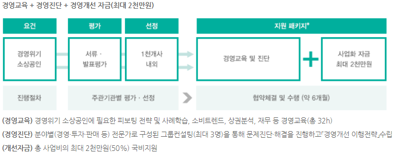 사업화지원의 지원 목적은 경영위기를 겪고 있는 소상공인의 경영진단 및 경영개선 전략수립 자금지원을 통해 경영정상화로 폐업을 선제적 예방하기 위한 사업입니다.