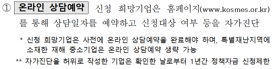 융자 신청 · 접수 ■ 중소기업 정책자금 융자 신청 : 온라인 신청 방식(회원가입 후 진행) 융자 신청은 ‘온라인 신청예약 → 사전상담 → 온라인신청’ 순으로 진행되며 당월 자금 희망기업은