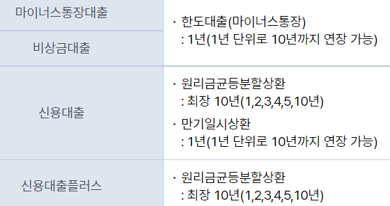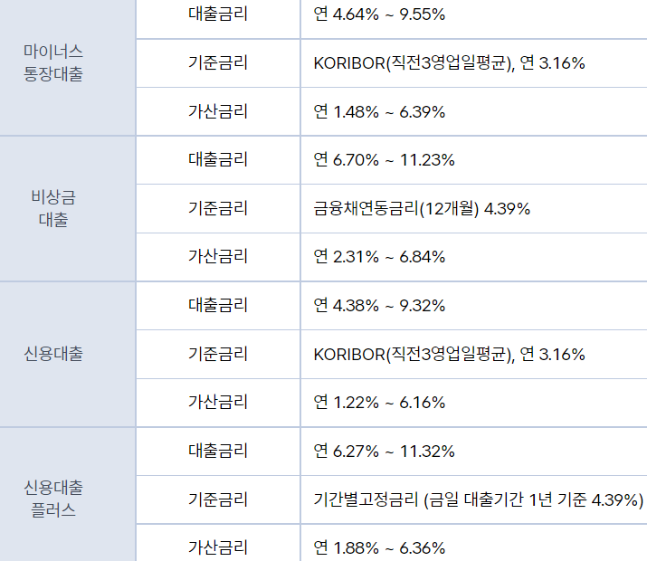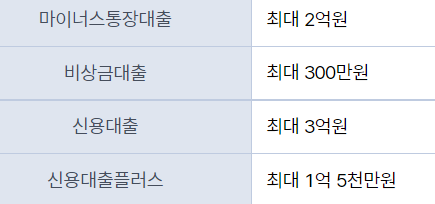 일반마이너스통장대출,신용대출,신용대출플러스,비상금대출로 조건은 아래와 같습니다.